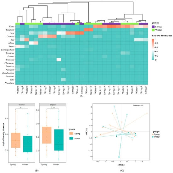 (A) Heatmap of relative abundance of crop genera and hierarchical clustering analysis based on Bray-Curtis distance, with colored strips indicating sample groupings for spring (purple) and winter (green) seasons; (B) Comparison of alpha diversity indices for crop feeding between spring and winter seasons, including box plots of Shannon diversity index and Simpson diversity index; (C) Non-metric multidimensional scaling (NMDS) ordination analysis based on crop feeding composition differences, showing community structure separation patterns between spring and winter season samples.
