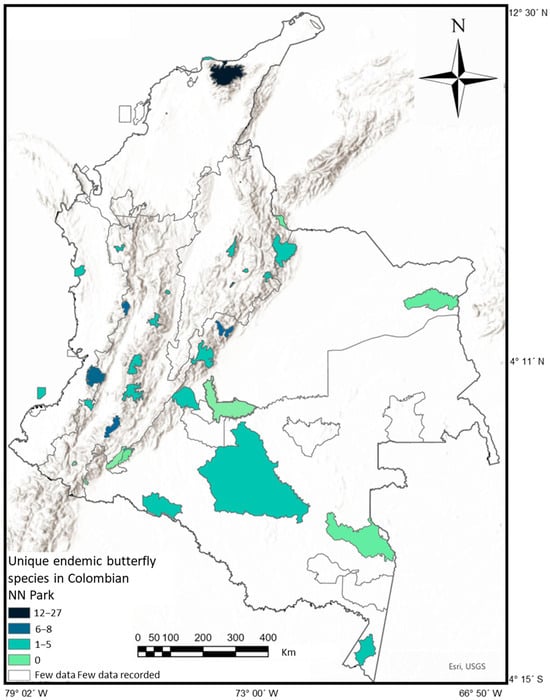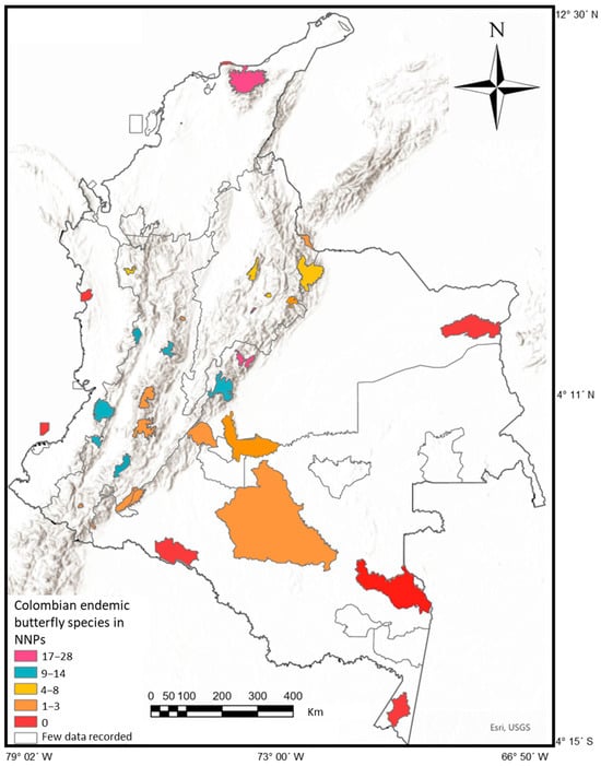 The following supporting information can be downloaded at: https://www.mdpi.com/article/10.3390/d17080536/s1, Annex S1: Pdf file with the Reference List used in defining the presence of Colombian endemic butterfly species in Colombian National Natural Parks; Annex S2: Excel file with the Database of presence of records of endemic species of butterflies for each National Natural Park.