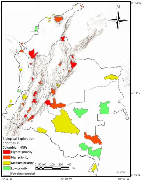 These findings are consistent with analyses of species records from NNPs deposited in the Biodiversity Information System for the Colombian biota (SiB Colombia) and GBIF [38], which also highlight the need for more comprehensive sampling across many protected and unprotected areas. This limitation stems from the fact that current inventories in Colombian NNPs and the Tropical Andes are not the result of systematic data collection, but rather reflect the concentration of sampling efforts in a few specific parks, often those near urban centers or with easier access [13].