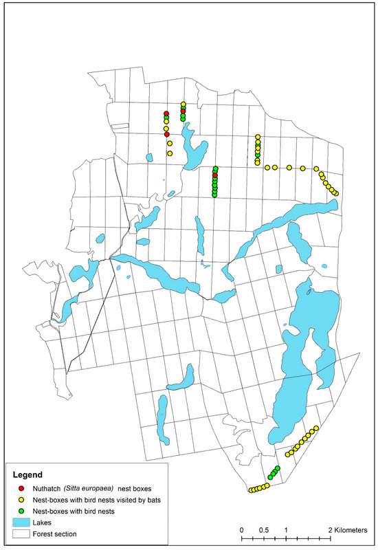 The metadata for each nest box, including the species of the bird inhabiting the nest box, information on whether or not bats visit the box, and the composition of the material used to line the box, was stored in the Analizator 2.0 computer database in the Natural History Collections (Faculty of Biology, AMU, Poznań).