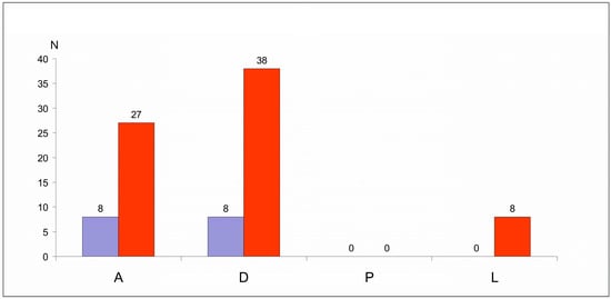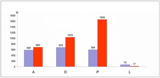 Abundance (N) of Leiodinychus orbicularis life stages (A—adults, D—deutonymphs, P—protonymphs, L—larvae) in nest boxes in the subsequent survey years (2023—blue, 2024—red).