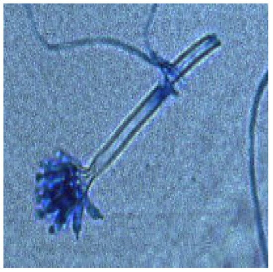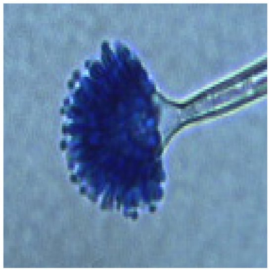 Morphotype Aspergillus-4: Cottony texture, grey, white, or dark beige mycelia, with white margin (Figure 7). Hyaline conidiophores with globular-to-subglobular vesicles, phialides growing directly on the vesicle, and globular-to-subglobular conidia (Figure 8).