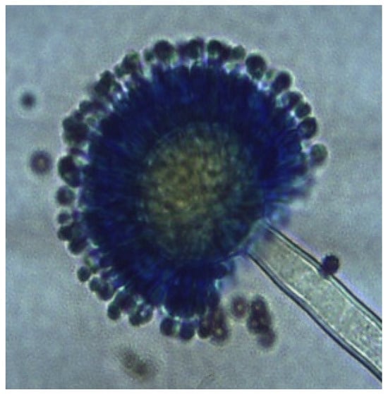 Morphotype Aspergillus-1: Smooth topography, granular or cottony texture, pale white color, irregular margin, and white spores (Figure 1). Figure 2 illustrates the reproductive structure of Aspergillus-1 at 40× magnification, showing a typical conidial arrangement. Hyaline conidiophore with smooth walls. Globular vesicle and hyaline, globular to subglobular conidia (Figure 2).