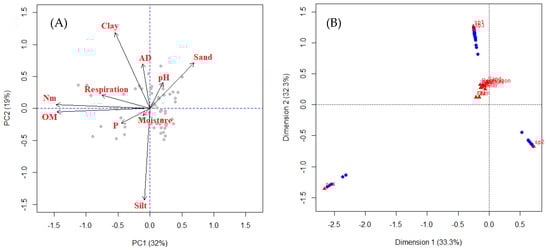 (A) Principal Component Analysis (PCA) and (B) Cluster Analysis (CA) illustrating the relationships among soil physicochemical and biological properties across sampling sites in the Banco Totumo–Bijibana Natural Reserve. The PCA biplot highlights the variables contributing most to the variance in the dataset, while the CA dendrogram groups sampling units based on similarity in soil attributes, providing insight into post-fire soil functioning and microbial activity patterns. OM: Organic matter; Nm: mineralized nitrogen; AD: apparent density.