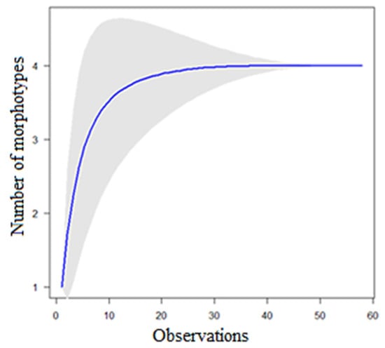 Diversity indices for soil in the BTBNR were made from the four morphotypes of Aspergillus identified. The D indicated medium diversity (0.67) while H (1.32) was interpreted as low biodiversity. ACE represents that communities have been sampled with roughly equivalent intensity relative to their overall richness. The species accumulation curve reached an asymptote with four morphotypes as the sampling effort increased, corresponding to CFU quantification, indicating that the slope of the trend line of the data would not improve and would stabilize after 30 observations (Figure 10).
