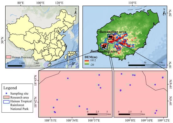 The Bawangling branch and the Jianfengling branch of the National Park of Hainan Tropical Rainforest are located in the southwestern part of Hainan Island. The Bawangling branch (18°57′–19°11′ N, 109°03′–109°17′ E) spans an elevation range of 50–1654 m, while the Jianfengling branch (18°34′–18°52′ N, 108°44′–109°04′ E) has an elevation range of 112–1654 m [25]. Both areas are characterized by a tropical monsoon climate and host abundant plant resources, including nationally protected species such as Hainanodendron hainanensis, Vatica mangachapoi, and Cephalotaxus hainanensis. In Bawangling, the annual average temperature is 23.6 °C, with an average annual precipitation of 1657 mm. The soil is predominantly laterite, formed from weathered granite and limestone, which helps maintain year-round moisture within the forest. In contrast, Jianfengling experiences a slightly higher annual average temperature of 24.5 °C and an average annual precipitation of 2265.8 mm. The soil types found in this area include latosol, lateritic yellow soil, yellow soil, and dry red soil, with lateritic yellow soil and latosol being the most widespread [26].