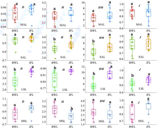 Differences in species diversity indices among different regions within the same forest layer. Note: BWL stands for Bawangling; JFL stands for Jianfengling; MAL represents the middle arbor layer; SAL represents the small arbor layer; LSL represents the large shrub layer; MSL represents the middle shrub layer; D denotes the Simpson diversity index; H denotes the Shannon–Wiener diversity index; DM denotes the Margalef richness index; J denotes the Pielou evenness index.