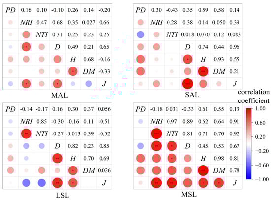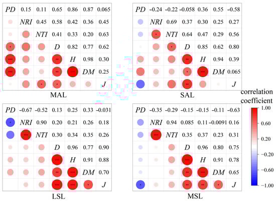 Correlation analysis of species diversity in different forest layers and phylogenetic diversity of dominant tree species in Bawangling. Note: MAL denotes the middle arbor layer; SAL denotes the small arbor layer; LSL denotes the large shrub layer; MSL denotes the middle shrub layer; PD represents the phylogenetic diversity index; NRI represents the net relatedness index; NTI represents the nearest taxon index; D represents the Simpson diversity index; H represents the Shannon–Wiener diversity index; DM represents the Margalef richness index; J represents the Pielou evenness index; *: p < 0.05, **: p < 0.01, ***: p < 0.001.
