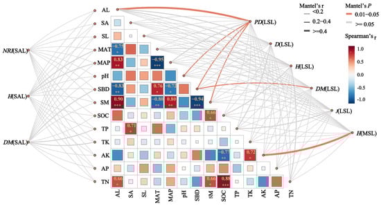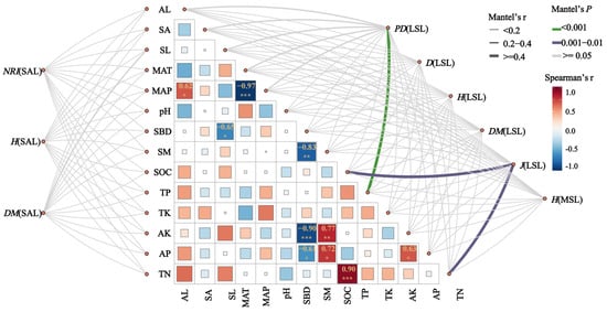 The Mantel test of the diversity index of the community in Bawangling where Hopea hainanensis is located and environmental factors. Note: AL stands for altitude; SL stands for slope; SA stands for aspect; MAT stands for mean annual temperature; MAP stands for mean annual precipitation; SM stands for soil moisture; pH stands for acidity/alkalinity; SBD stands for soil bulk density; SOC stands for soil organic carbon; TP stands for total phosphorus; TN stands for total nitrogen; TK stands for total potassium; AP stands for available phosphorus; AK stands for available potassium; NRI(SAL) represents the net relatedness index of the small arbor layer; H(SAL) represents the Shannon–Wiener diversity index of the small arbor layer; DM(SAL) represents the Margalef richness index of the small arbor layer; PD(LSL) represents the phylogenetic diversity index of the large shrub layer; D(LSL) represents the Simpson diversity index of the large shrub layer; DM(LSL) represents the Margalef richness index of the large shrub layer; J(LSL) represents the Pielou evenness index of the large shrub layer; H(MSL) represents the Shannon–Wiener diversity index of the medium arbor layer; *: p < 0.05, **: p < 0.01, ***: p < 0.001.