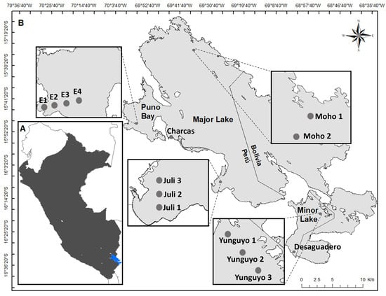 Lake Titicaca, located in South America, spans southern Peru and northwestern Bolivia, between 14°05′ and 16°50′ north and 68°10′ and 71°05′ west. In Perú, it lies entirely within the department of Puno and has a surface water availability of 9877 hm3. Water samples were collected from Lake Titicaca in 2021 during the wet season (April) and dry season (September). Fourteen sampling sites were selected across three distinct areas of Lake Titicaca, namely Puno Bay (BA), Major Lake (MA), and Minor Lake (MI) (Figure 1). These same sampling sites were used for molecular analyses.