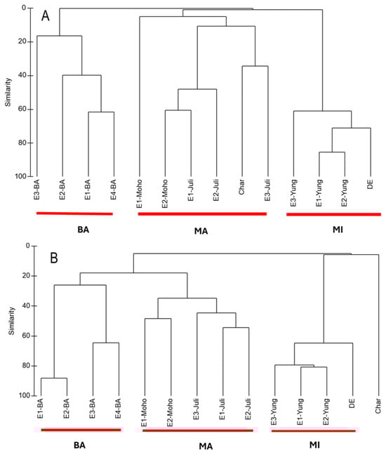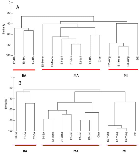 For microscopic data, microalgal abundance was quantified as cell density (cells/L) for each taxonomic group. In contrast, metabarcoding data were represented by the relative abundance of each amplicon sequence variant (ASV). Cluster analyses based on Bray–Curtis similarity were performed using PRIMER v6 software [37] applying a log(x+1) transformation to both ASV abundance (molecular data) and taxon density (microscopy data) for 14 samples (N = 14). To compare the composition of microalgal assemblages between the two methods, relative abundance matrices were analyzed separately for each sampling area, Puno Bay (BA), Major Lake (MA), and Minor Lake (MI), across both wet (WS) and dry (DS) seasons.