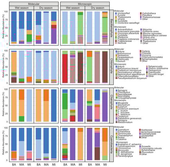Composition of Bacillariophyta, Chlorophyta, Charophyta, and Cyanobacteria communities at the genus level for each sample analyzed in Bahía de Puno (BA), Lago Major (MA), and Lago Minor (MI) using molecular and microscopy analyses, showing the relative abundance of the genera detected in the wet season (WS) and dry season (DS) of 2021.