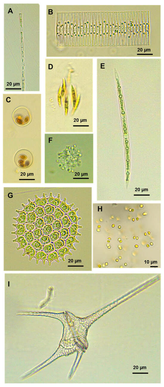 Micrographs of some microalgae identified using optical microscopy in Lake Titicaca. (A) Aulacoseira granulata, (B) Fragilaria crotonensis, (C) Oocystis borgei, (D) Elakatothrix genevensis, (E) Closterium sp., (F) Snowella sp., (G) Pseudopediastrum boryanum, (H) Limnococcus sp., and (I) Ceratium hirundinella.