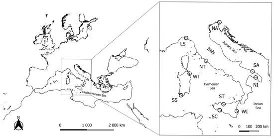 Map of the 10 sampled stations of H. polii and H. tubulosa along the Italian coast. NA: Northern Adriatic Sea, SA: Southern Adriatic Sea, NI: Northern Ionian Sea, WI: Western Ionian Sea, SC: Sicilian Channel, ST: Southern Tyrrhenian Sea, SS: Sea of Sardinia, WT: Western Tyrrhenian Sea, NT: Northern Tyrrhenian Sea, LS: Ligurian Sea.