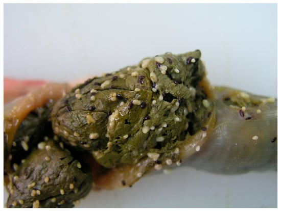 Rectal content of a heavily infected cat with dipylidiid cestodes. White proglottids belonged to Joyeuxiella spp., while dark-coloured structures are gravid segments of Diplopylidium nölleri.