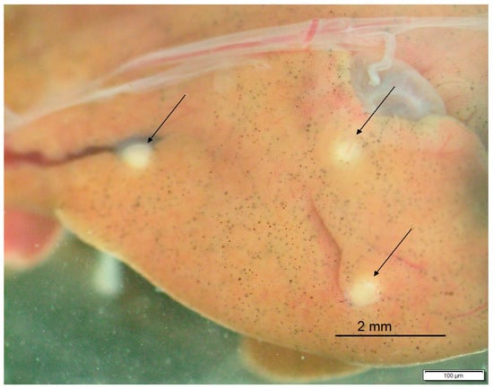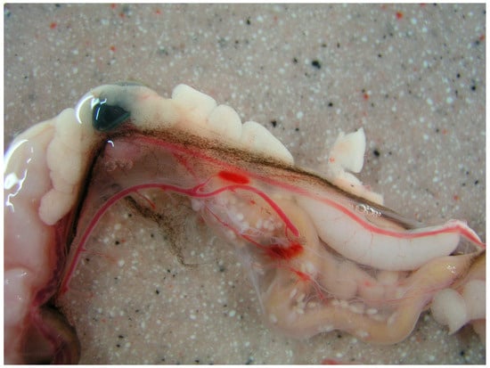 The involvement of reptiles in the life cycle of dipylidiid cestodes has been known for a long time and was reviewed by Witenberg (1932) []. In Italy, armed cysticercoids attached to the intestinal wall of a common wall gecko (Tarentola mauritanica) were described for the first time in 1872 []. Another finding of a similar cestode larva was made in the intestinal wall of a whip snake (Hierophis viridiflavus) from Sardinia in 1886 []. Based on the morphology of the scolex, it was concluded that such cysticercoids might be the larval stage of Dipylidium trinchesi, known today as Diplopylidium acanthotetra (Parona, 1886) [], and only 34 years later, the connection between such cysticercoids and adult cestodes was proven by successfully infecting cats with cysticercoids obtained from common wall geckos [].
