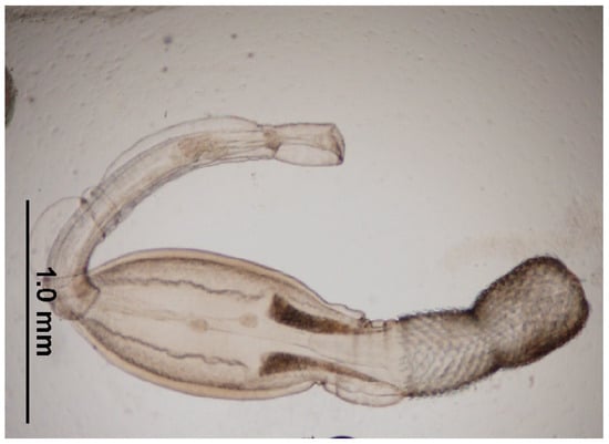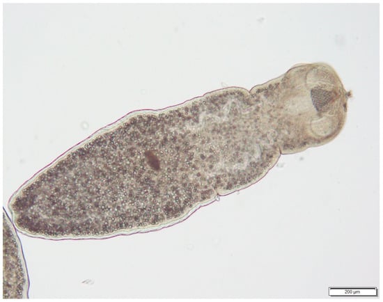 Already in the first third of the 20th century, studies of the life cycle of Joyeuxiella spp. were carried out. By feeding larval stages from geckos to cats, the role of reptiles in the life cycle of these cestodes was experimentally proven [,]. But the way in which reptiles become infected remains unclear. It has already been assumed that insects are involved in the life cycle []. Recently, feeding experiments were carried out with mice and darkling beetles and their larvae, but all of the trials so far have given negative results [].