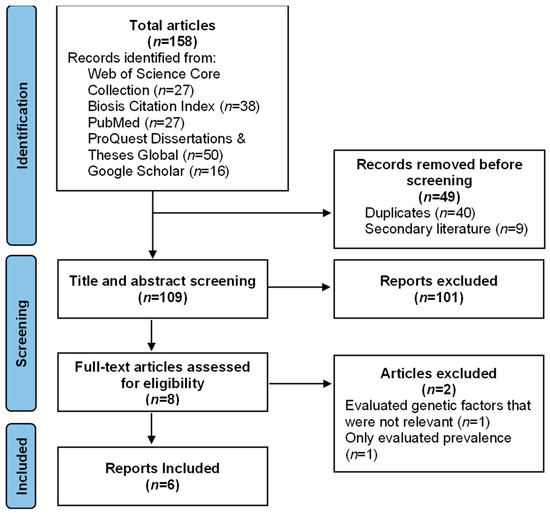 The literature search for the effect of M. leprae-infection on wild armadillo population demographics and spatiotemporal patterns of infection revealed a total of 158 articles. Before the first screening we removed 49 records, including 40 duplicates and nine secondary literature sources. During the title and abstract screening, 101 records were removed according to the inclusion and exclusion criteria (Figure 1). Common reasons for exclusion include the clinical study of laboratory armadillos, the study of a disease other than leprosy, or the study of an individual armadillo rather than populations. The final screening of the full text was performed for the remaining 8 records. We removed two records due to their evaluation of D. novemcinctus genetic factors and recording pathogen prevalence without at least one of the topics related to demographic effects or spatiotemporal patterns [42,43]. The result was therefore six relevant records that were included in the review [44,45,46,47,48,49].