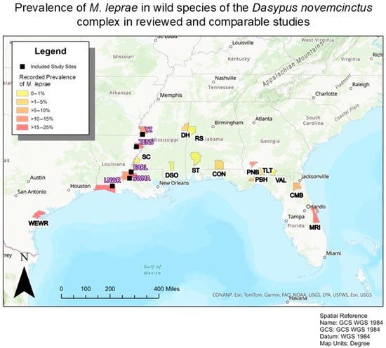 Utilizing the prevalence of M. leprae-infection detected via ELISA, these values were compared to other prevalence studies in the region that did not qualify for inclusion in this review [17,19] and were found to have higher prevalence values overall. In these comparable studies, there were duplicate study sites, DeWayne Hayes Recreational area and Pinebloom Plantation, in which the prevalences were averaged across the two studies for comparison [17,19]. It should also be noted that the diagnostic methods of one of these studies utilized both ELISA and polymerase chain reaction (PCR) [17]. We mapped the recorded prevalences of these studies alongside those included in this review for comparison (Figure 2).