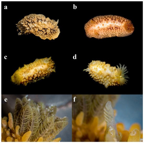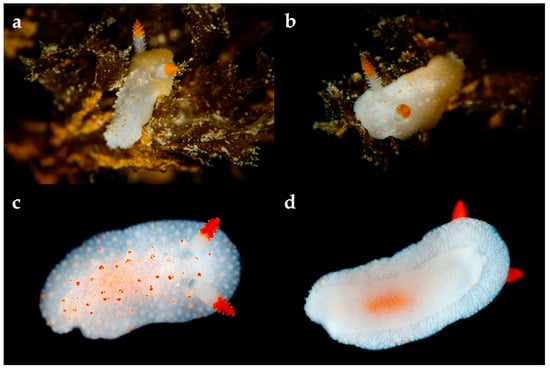 - Furfaro, G.; Salvi, D.; Trainito, E.; Vitale, F.; Mariottini, P. When morphology does not match phylogeny: The puzzling case of two sibling nudibranchs (Gastropoda). Zool. Scr. 2021, 50, 439–454. [Google Scholar] [CrossRef]