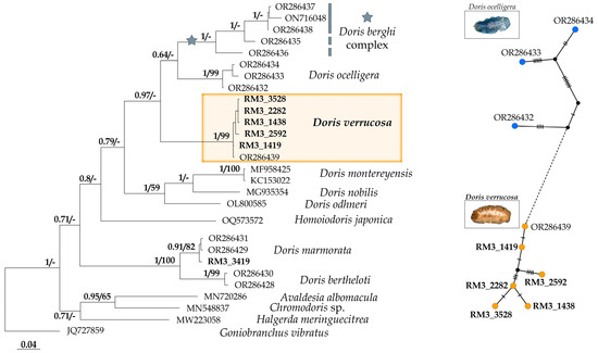 Chicago/Turabian StyleFurfaro, Giulia, Michele Solca, Enric Madrenas, Francesco Tiralongo, and Egidio Trainito. 2025. "Molecular Updates on the ‘Warty Dorid’ Doris verrucosa Linnaeus, 1758 (Mollusca, Nudibranchia) from the Mediterranean Sea" Diversity 17, no. 8: 586. https://doi.org/10.3390/d17080586