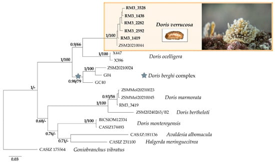 Furfaro, G.; Solca, M.; Madrenas, E.; Tiralongo, F.; Trainito, E. Molecular Updates on the ‘Warty Dorid’ Doris verrucosa Linnaeus, 1758 (Mollusca, Nudibranchia) from the Mediterranean Sea. Diversity 2025, 17, 586. https://doi.org/10.3390/d17080586