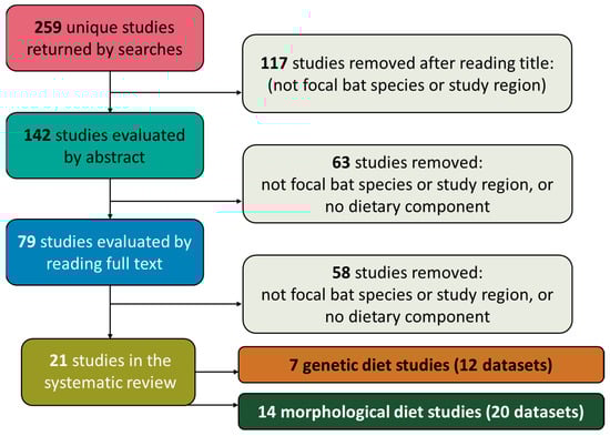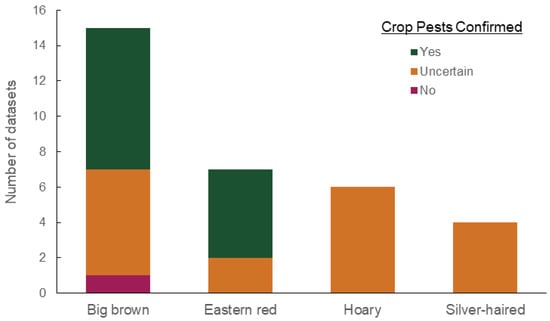 Chicago/Turabian StyleHale, Amanda M., Cecily Foo, John Lloyd, and Jennifer Stucker. 2025. "Systematic Review of Crop Pests in the Diets of Four Bat Species Found as Wind Turbine Fatalities" Diversity 17, no. 8: 590. https://doi.org/10.3390/d17080590