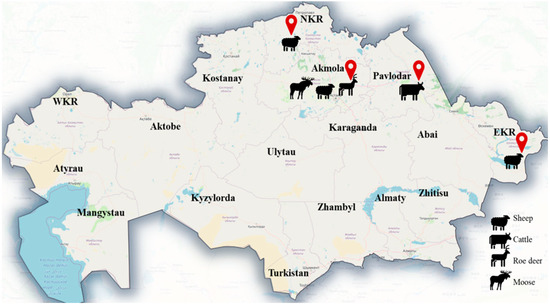 Taenia species have been extensively studied globally, their epidemiology and genetic diversity in Kazakhstan remain poorly understood. In this study, wild (roe deer, red deer, moose) and domestic (cattle, sheep) ungulates, serving as intermediate hosts for