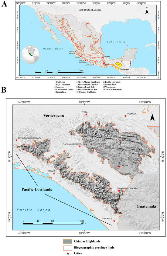 Figure 1. Topographic map of the Chiapas Highlands of Mexico. (A) Overview of Mexico’s fourteen biogeographic provinces, with the Chiapas Highlands highlighted in bright yellow. The map also shows portions of the southern United States and northern Central America (Guatemala and Belize) for geographic context. (B) Detailed view of the Chiapas Highlands of Mexico and surrounding provinces, illustrating regional topography and adjacent areas [33].