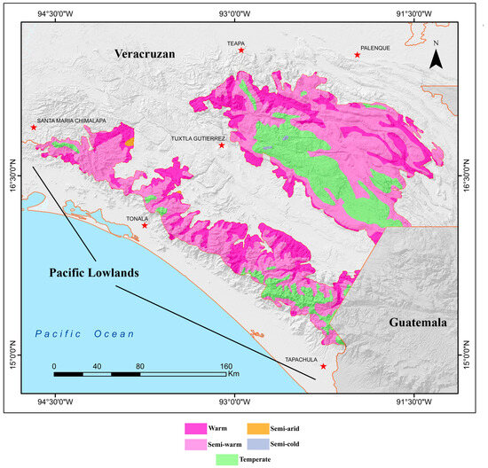 Due to the substantial altitudinal range and rugged topography of the Chiapas Highlands, this region contains a wide variety of climates [34] (Figure 2). Semi-warm climates predominate at mid-altitudes in both the Sierra Madre and the Chiapas Central Massif, while warm climates are found along the slopes of the mountain ranges. Temperate climates cover extensive areas in the higher elevations, and small patches of semi-cold climate occur in the highest zones, such as the area surrounding San Cristóbal de las Casas. Additionally, two small patches of semi-arid climate are present, one in the lower northern extremes of the Sierra Madre de Chiapas and another in the central part of this mountain range.