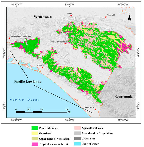 Figure 3. Map showing the vegetation and land cover types in the Chiapas Highlands biogeographic province of Mexico, based on the classification provided by Instituto Nacional de Estadística y Geografía (INEGI) [35]. Categories represent generalized land cover types and are intended to provide broad landscape context for the province: Pine–Oak Forest includes temperate forests dominated by Pinus and Quercus species; Grassland refers to natural or semi-natural open herbaceous areas; Other types of vegetation encompasses heterogeneous or transitional areas not assigned to a single dominant category; Tropical montane forest includes humid, closed-canopy forests at lower elevations, such as cloud forest; Agricultural area includes croplands and pasture; Area devoid of vegetation includes bare soil or rocky surfaces; Urban area corresponds to developed land; and Body of water includes both marine and freshwater habitats.