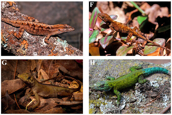 Figure 5. Photos of some of the lizard species endemic to the Chiapas Highlands: (A) Abronia lythrochila, San Cristobal de las Casas, Chiapas; (B) Abronia moreletii, San José Bocomtenelté, San Cristóbal de las Casas, Chiapas; (C) Abronia smithi, Rincón Estrella, Motocintla, Chiapas; (D) Anolis anisolepis, San Cristóbal de las Casas, Chiapas; (E) Anolis crassulus, Volcán Tacaná, Chiapas; (F) Anolis hobartsmithi, Rayón Mescalapa, Chiapas; (G) Anolis parvicirculatus, Berriozabal, Chiapas; (H) Sceloporus smaragdinus, Rincón Estrella, Siltepec, Chiapas. Photos (AF,H) by Peter Heimes; Photo (G) by Eric Centenero Alcalá.
