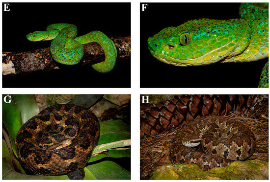 Figure 6. Photos of some of the lizard and snake species endemic to the Chiapas Highlands: (A) Sceloporus taeniocnemis, Las Margaritas, Chiapas; (B) Adelphicos nigrilatum; (C) Coniophanes alvarezi, San Cristobal de las Casas, Chiapas; (D) Bothriechis aurifer, in captivity; (E,F) Bothriechis bicolor, in captivity; (G) Cerrophidion godmani, in captivity; (H) Cerrophidion tzotzilorum, in captivity. Photos (A,CH), by Eric Centenero Alcalá; Photo (B) by Peter Heimes.