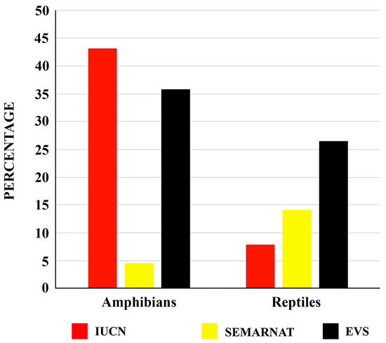 Figure 7. Percentage of amphibian and reptile species from the Chiapas Highlands biogeographic province of Mexico that are under conservation concern. Species are categorized as Vulnerable, Endangered, or Critically Endangered according to the IUCN Red List [26], as Threatened (A) or in Danger of Extinction (P) by the Mexican government [27], or as high-risk based on the Environmental Vulnerability Score (EVS) [28,29].