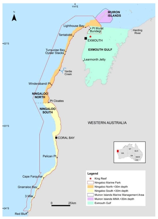 Ningaloo Reef, a UNESCO World Heritage site, extends approximately 300 km along the Cape Range Peninsula and is one of the world’s largest western-facing fringing coral reefs. Protected since 1987 within the Ningaloo Marine Park (Figure 1), which covers about 5000 km2, the park includes 18 sanctuary zones spanning ~1300 km2, roughly 26% of its area. It is a hotspot for tourism; it experiences relatively low pollution levels and has Ecosystem-Based Fisheries Management Strategies for recreational and commercial fishing activities []. The reef is celebrated for its low-turbidity waters, resulting from minimal river runoff and an extensive scleractinian coral community. Summer winds generate the Ningaloo Current, which flows along the inner shelf and enhances nutrient availability in the lagoon, and the regional nutrient supply is enhanced through episodic upwellings [,]. The main reef consists of elongated segments separated by gaps that promote lagoon flushing, with an average depth of about 2 m []. In northern Ningaloo, a narrow continental shelf (sometimes less than 10 km wide) brings nutrient-rich waters close to the reef, boosting pelagic productivity and attracting migratory filter feeders like manta rays and whale sharks [,] along with a large sea turtle population that principally resides in the lagoonal areas [,].