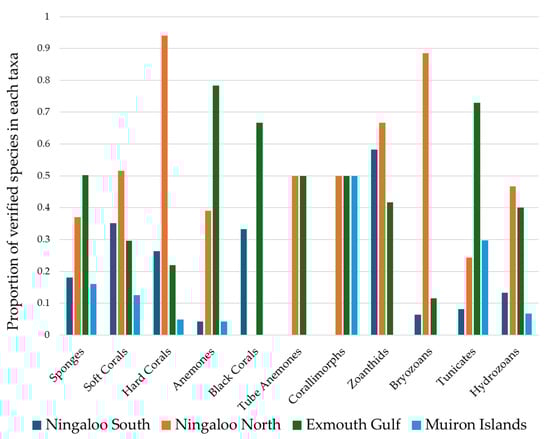 Proportional verified records for each taxonomic group of sessile benthic fauna in the four subregions.