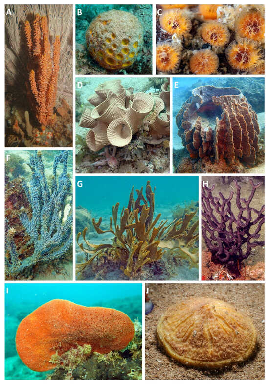 Sponges (Photo credits G. Whisson). (A) Caulospongia perfoliata; (B) Cinachyrella australiensis; (C) Cliona celata; (D) Lanthella basta; (E) Xestospongia testudinaria; (F) Gelliodes fibulata; (G) Phyllospongia papyracea; (H) Echinodictyum pulchrum; (I) Trikentrion flabelliforme; (J) Xenospongia patelliformis.