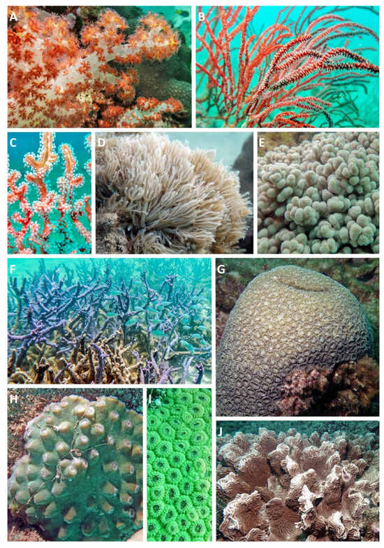 Soft Corals (A–E) and Hard Corals (F–J) (Photo credits A. Hoschke). (A) Dendronephthya sp.; (B) Dichotella gemmacea; (C) Solenocaulon sp.; (D) Latissimia ningalooensis; (E) Sclerophytum sp.; (F) Acropora muricata; (G) Dipsastrea sp.; (H) Duncanopsammia peltata; (I) Plesiastrea peroni; (J) Pachyseris rugosa.