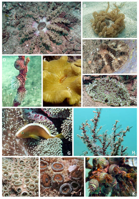 Anemones (A–G) and Zoanthids (H–K) (Photo credits A. Hoschke) (A) Actinodendron alcyonoideum; (B) Dofleinia armata; (C) Alicia pretiosa; (D) Nemanthus nitidus; (E) Stichodactyla haddoni; (F) Entacmaea quadricolor; (G) Stichodactyla mertensii; (H) Hydrozoanthus gracilis; (I) Palythoa tuberculosa; (J) Zoanthus sansibaricus; (K) Acrozoanthus sp. (undescribed).