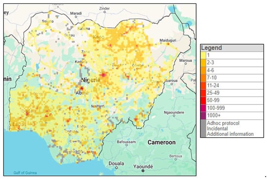 The study was conducted in Nigeria based on the coverage of the Nigerian Bird Atlas Project (NiBAP) (Figure 1). Nigeria lies on latitude 9.0820° N and longitude 8.6753° E, covering 923,768 km2 of land with four distinct vegetation zones: rainforest, savanna (Guinea, Sahel, Sudan), mangrove, and desert [19,20]. About 25% of land in Nigeria is under cultivation and mining activities contributing to unquantified land degradation, while 40% of Nigeria’s forest landscape is still standing [21,22,23]. As of 2020, the Nigerian population was estimated at 200 million and projected to reach 440 million by 2050 [24,25]. Nigeria is a multicultural country with various ethnic groups and languages. The most dominant ethnic groups in the northeastern parts are the Hausa and Fulani.