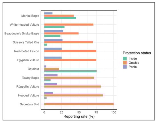 Notable variation was observed in relative percentage reporting rates among protected area categories, classified as inside, outside, and partially inside protected areas (Figure 3). Overall, the majority of detections for most species occurred outside protected areas. For instance, the Hooded Vulture (Necrosyrtes monachus), Secretary Bird (Sagittarius serpentarius), and Rüppell’s Vulture (Gyps rueppelli) had over 80% of detections recorded outside protected boundaries. In contrast, only a few species showed higher proportions of activity within protected zones; notably, the Bateleur (Terathopius ecaudatus) had the highest proportion inside PAs (75.6%), followed by the Martial Eagle (Polemaetus bellicosus) (45.8%) and White-headed Vulture (Trigonoceps occipitalis) (29.2%). See Figure 3 and Supplementary S3 in Supplementary Materials.