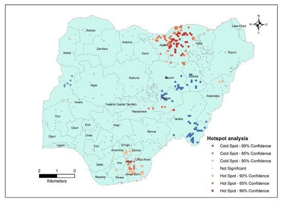 The Getis–Ord Gi* analysis revealed significant spatial clustering of raptors across Nigeria (Figure 4). Hotspots, areas with statistically high values, were predominantly located in Jigawa, northern Bauchi, and Yobe states. Cold spots, areas with statistically low values, were concentrated in southern Bauchi, Gombe, Plateau, and Taraba states (Figure 4).