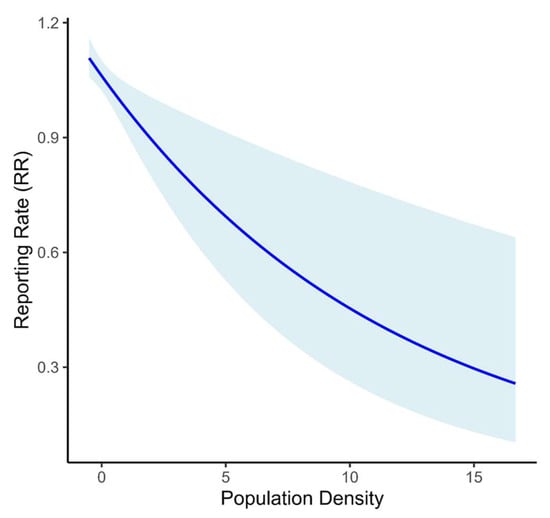 Effect of population density on the reporting rate of threatened raptors. The solid blue line shows predicted reporting rates, and the shaded region represents 95% confidence interval.