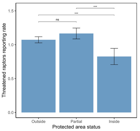 Effects of Protected Area status on the reporting rates of threatened raptors. Error bars and whiskers represent standard errors. *** represents the level of significance (p < 0.001) while ns represents non-significant difference.