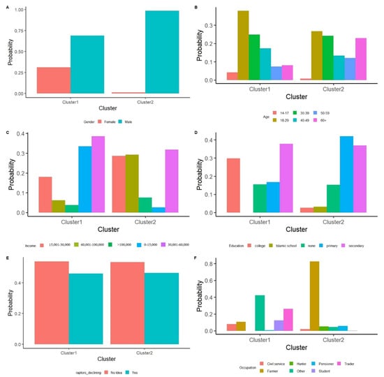 The latent class analysis (LCA) grouped respondents into two distinct clusters based on their knowledge of raptors: Cluster 1 (n = 156) and Cluster 2 (n = 162). Cluster 1 comprised a mixed group of males and females, whereas Cluster 2 was predominantly male (Figure 8A). Age distribution varied between clusters, with Cluster 1 primarily consisting of younger respondents (18–29 years), while Cluster 2 included a broader age range, including older individuals (Figure 8B). Socio-economic differences were also evident, as lower-income respondents dominated Cluster 1, whereas higher-income respondents were more prevalent in Cluster 2 (Figure 8C). Education levels also varied between clusters. Cluster 1 was largely composed of individuals with college and secondary school education, while Cluster 2 was dominated by respondents with primary and secondary education (Figure 8D). Occupational differences were notable, with Cluster 1 comprising a mix of professions, whereas Cluster 2 was primarily made up of farmers (Figure 8F).