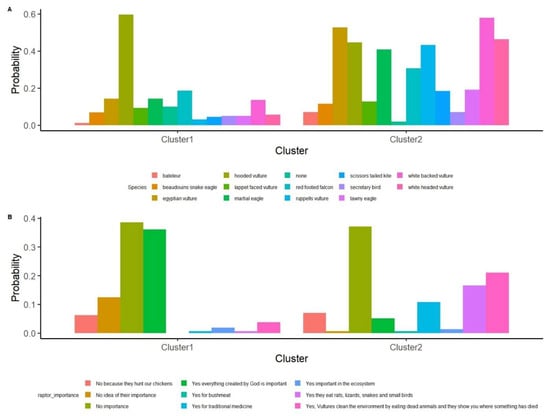 In terms of raptor knowledge, the majority of respondents in both clusters were unaware of the decline of threatened raptor species (Figure 8E). Perception of raptor importance also differed: most respondents in Cluster 1 believed raptors had no importance, followed by those who considered all creatures important because they were created by God. In contrast, while some individuals in Cluster 2 recognised specific ecological roles of raptors, a larger proportion believed raptors had no value beyond preying on their chickens (Figure 9A). Regarding species identification, respondents in Cluster 1 predominantly recognised the Hooded Vulture, whereas Cluster 2 exhibited a more evenly distributed knowledge of species such as the Egyptian Vulture, White-backed Vulture, Hooded Vulture, and White-headed Vulture (Figure 9B). Based on these distinctions, Cluster 1 was classified as “low raptor knowledge”, while Cluster 2 was identified as “high raptor knowledge”.