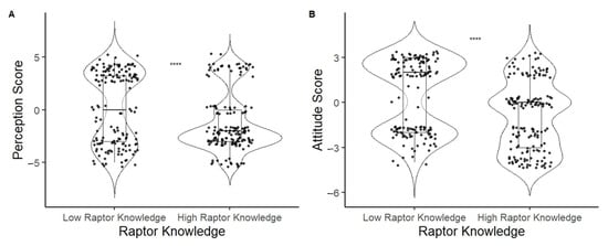 Differences in perceptions (A) and attitude (B) between people with low raptor knowledge and those with high raptor knowledge.