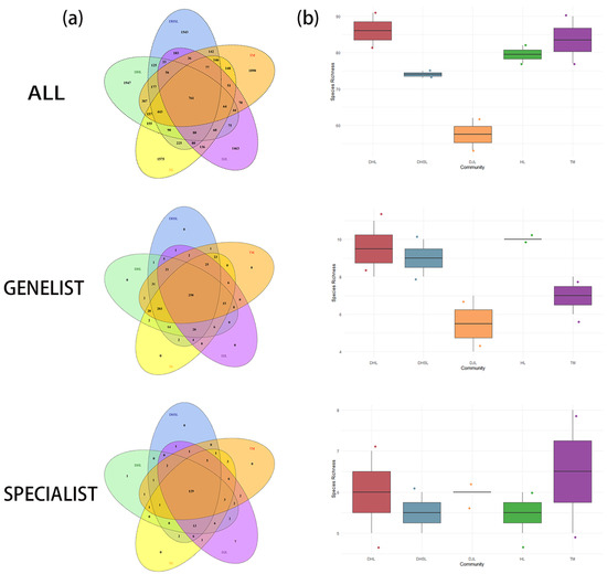 (a): Venn diagram of OTUs of rhizosphere soil bacteria of five orchid species, (b): boxplot of species richness of rhizosphere soil bacteria of five orchid species. DHL represents C. amoena, DHSL represents C. macranthos, DJL represents C. appendiculata, HL represents C. faberi, and TM represents G. elata.