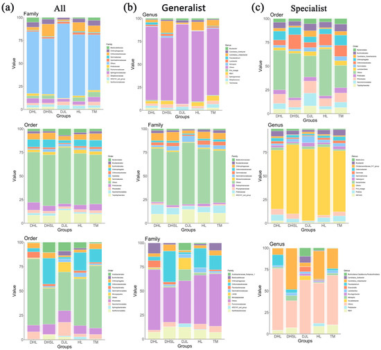 (a): Relative abundance of rhizosphere soil bacteria among all species for different orchids, (b): relative abundance of rhizosphere soil bacteria among generalist species for different orchids, (c): relative abundance of rhizosphere soil bacteria among specialist species for different orchids. DHL represents C. amoena, DHSL represents C. macranthos, DJL represents C. appendiculata, HL represents C. faberi, and TM represents G. elata.