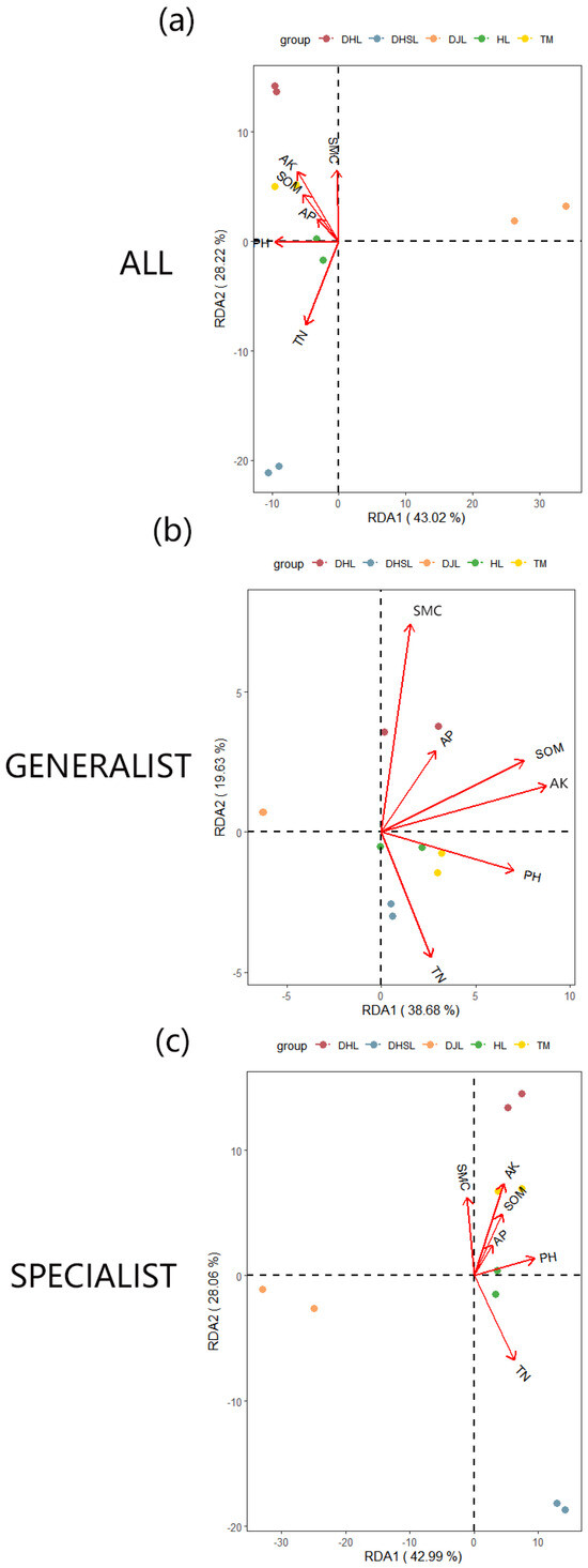 Redundancy analysis of rhizosphere soil bacterial community structure and environmental factors for different orchid species. (a): All species, (b): general species, (c): special species, SMC represents Soil Moisture Content, PH represents Potential of Hydrogen, AK represents Available Potassium (Attachment S2), AP represents Available P, SOM represents Soil Organic Matter, and TN represents Total Nitrogen. DHL represents C. amoena, DHSL represents Cypripedium macranthos, DJL represents C. appendiculata, HL represents C. faberi, and TM represents G. elata.